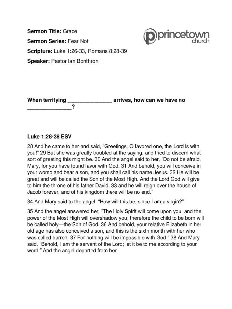 Sermon Title: Grace Sermon Series: Fear Not Scripture: Luke 1:2633, Romans 8:2839 Speaker: Pastor Ian BonthronWhen terrifying ___ arrives, how can we have no ___?Luke 1:2838 ESV 28 And he came to