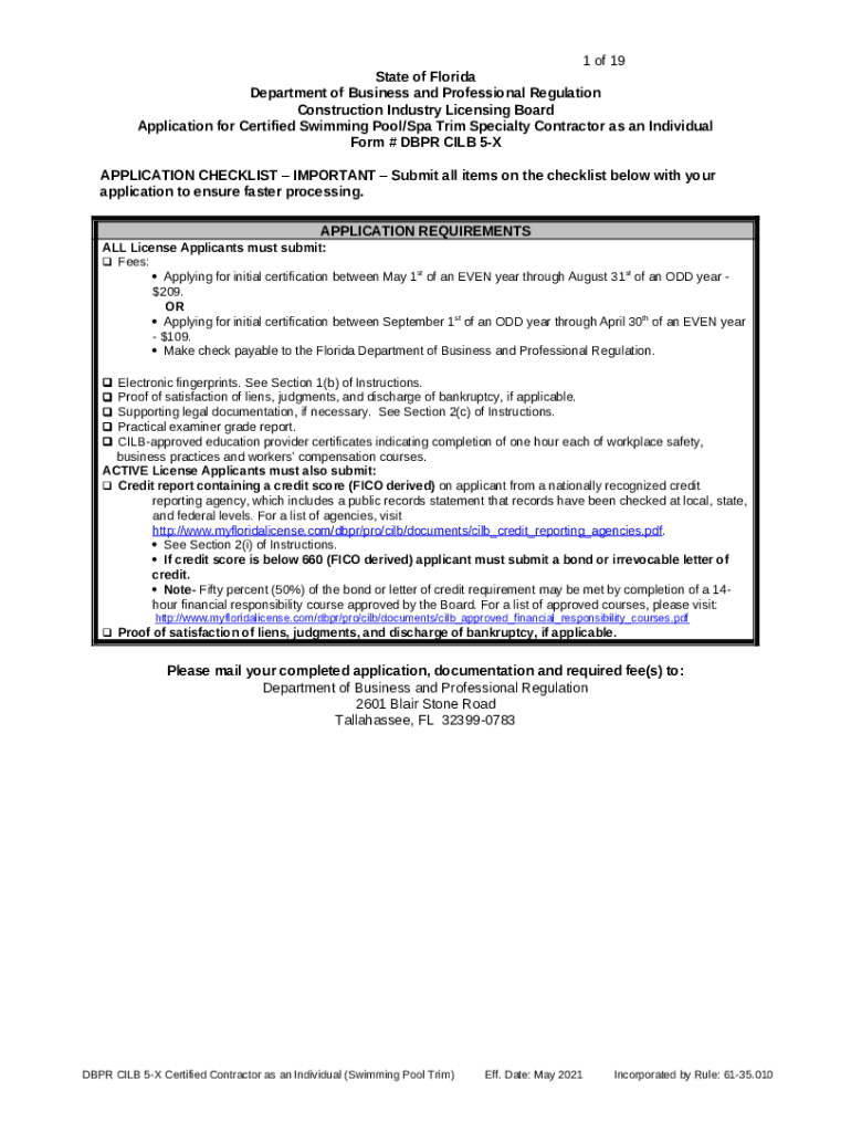 Instructions for the DBPR CILB 5-X - Certified Contractor as an Individual (Swimming Pool Trim) form