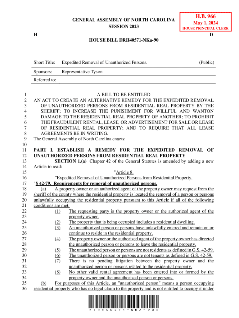 GENERAL ASSEMBLY OF NORTH CAROLINA SESSION 2023 HH.B. 966 May 1, 2024 HOUSE PRINCIPAL CLERKD HOUSE BILL DRH40571NKa90Short Title:Expedited Removal of Unauthorized Persons.Sponsors:Representative Tyson.(Public)Referred