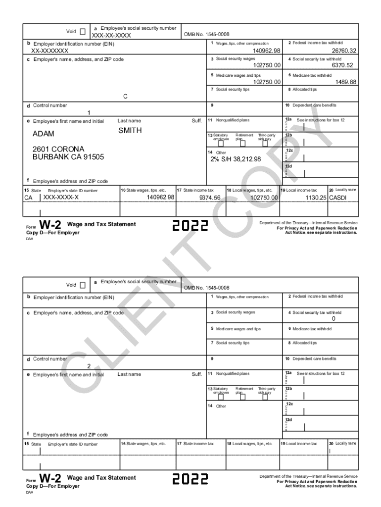 An Employee\'s social security numberVoidOMB No. 15450008XXXXXXXXXb Employer identification number (EIN)2 Federal income tax withheld1 Wages, tips, other compensation140962.98XXXXXXXXX c Employer\'s