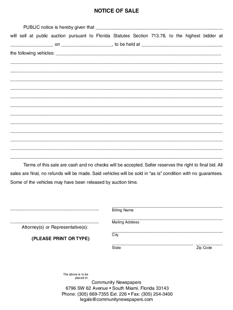 NOTICE OF SALE PUBLIC notice is hereby given that ___ will sell at public auction pursuant to Florida Statutes Section 713.78, to the highest bidder at ___ on ___, to be held at ___ the following