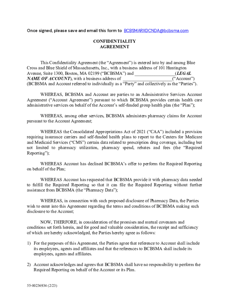 Once signed, please save and email this form to BCBSMARXDCNDA@bcbsma.comCONFIDENTIALITY AGREEMENT This Confidentiality Agreement (the Agreement) is entered into by and among Blue Cross and Blue Shield