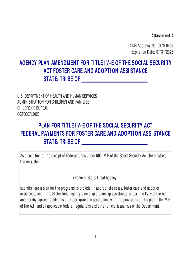Attachment A OMB Approval No. 09700433 Expiration Date: 07/31/2025AGENCY PLAN AMENDMENT FOR TITLE IVE OF THE SOCIAL SECURITY ACT FOSTER CARE AND ADOPTION ASSISTANCE STATE/TRIBE OF ___ U.S. DEPARTMENT