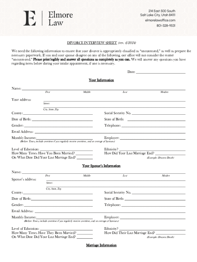 DIVORCE INTERVIEW SHEET (rev. 6/2024) We need the following information to ensure that your divorce is appropriately classified as uncontested, as well as prepare the necessary paperwork. If you and