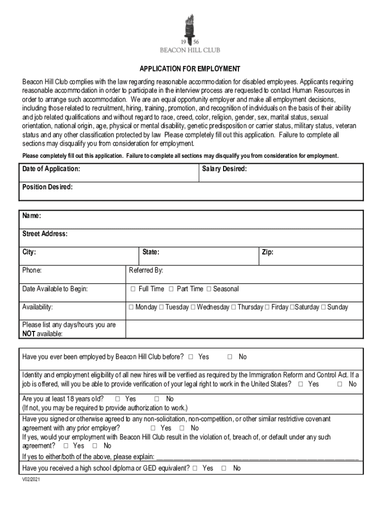 APPLICATION FOR EMPLOYMENT Beacon Hill Club complies with the law regarding reasonable accommodation for disabled employees. Applicants requiring reasonable accommodation in order to participate in