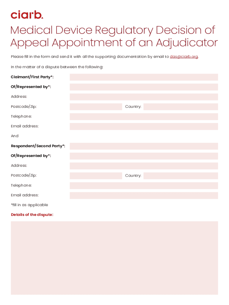 Medical Device Regulatory Decision of Appeal Appointment of an Adjudicator Please fill in the form and send it with all the supporting documentation by email to das@ciarb.org. In the matter of a dispute
