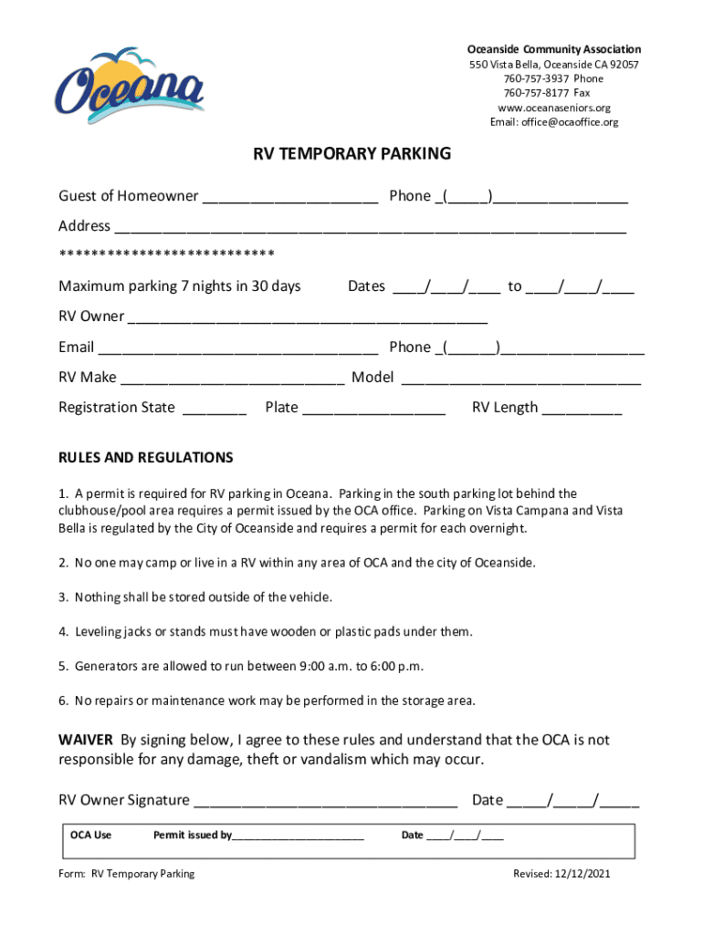 Oceanside Community Association 550 Vista Bella, Oceanside CA 92057 7607573937 Phone 7607578177 Fax www.oceanaseniors.org Email: office@ocaoffice.orgRV TEMPORARY PARKING Guest of Homeowner ___ Phone