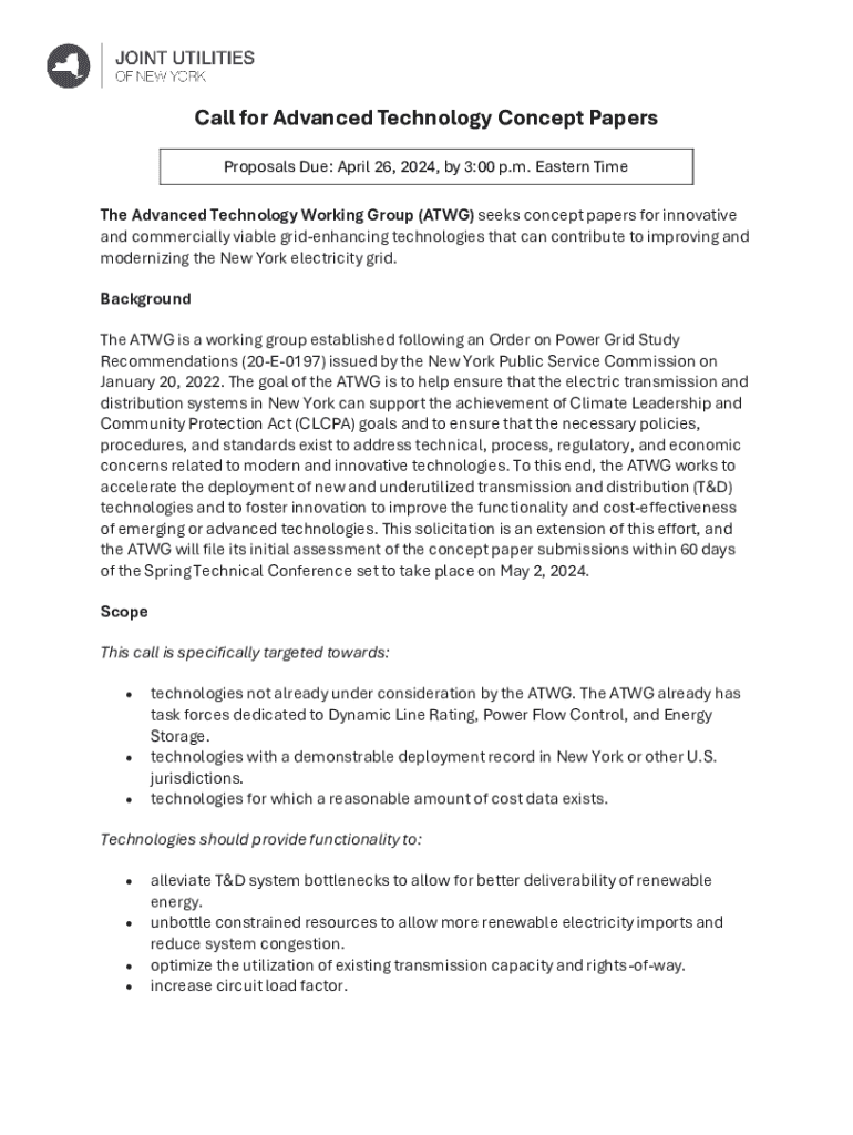 Call for Advanced Technology Concept Papers Proposals Due: April 26, 2024, by 3:00 p.m. Eastern Time The Advanced Technology Working Group (ATG) seeks concept papers for innovative and commercially