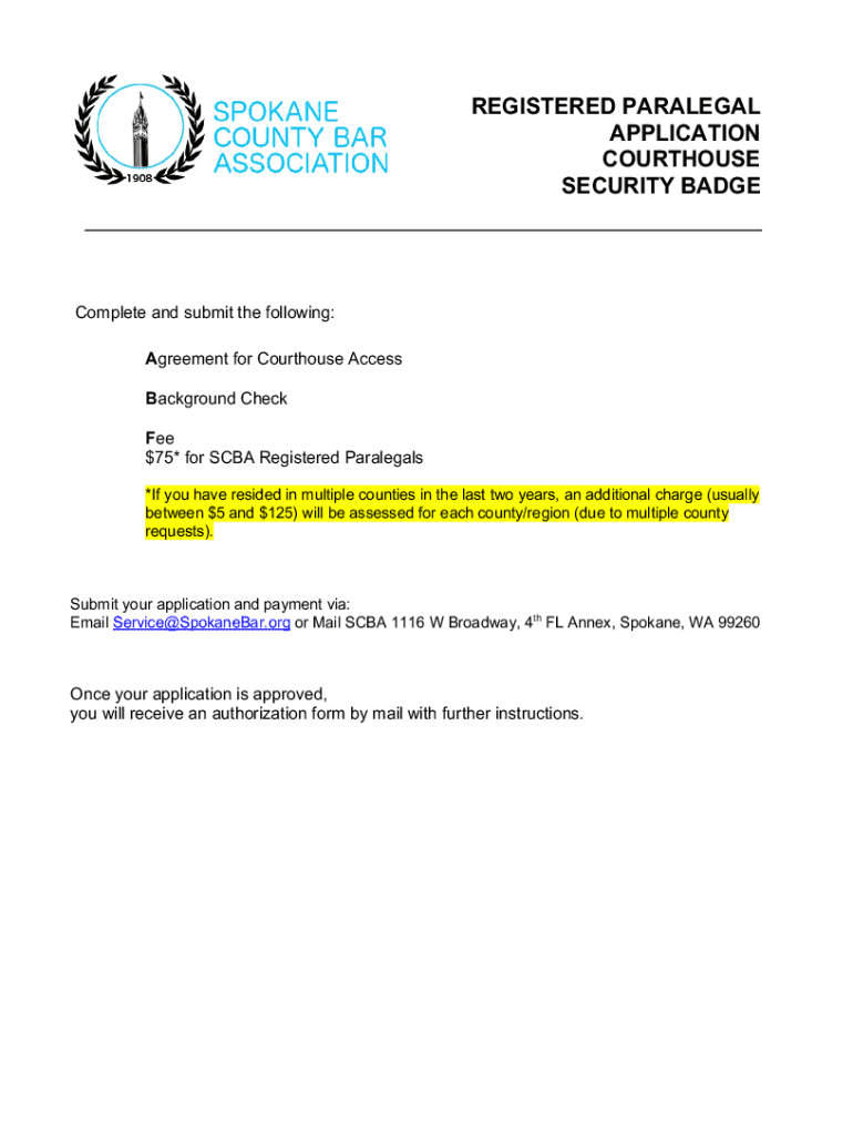 REGISTERED PARALEGAL APPLICATION COURTHOUSE SECURITY BADGEComplete and submit the following: Agreement for Courthouse Access Background Check Fee $75* for SCBA Registered Paralegals *If you have resided