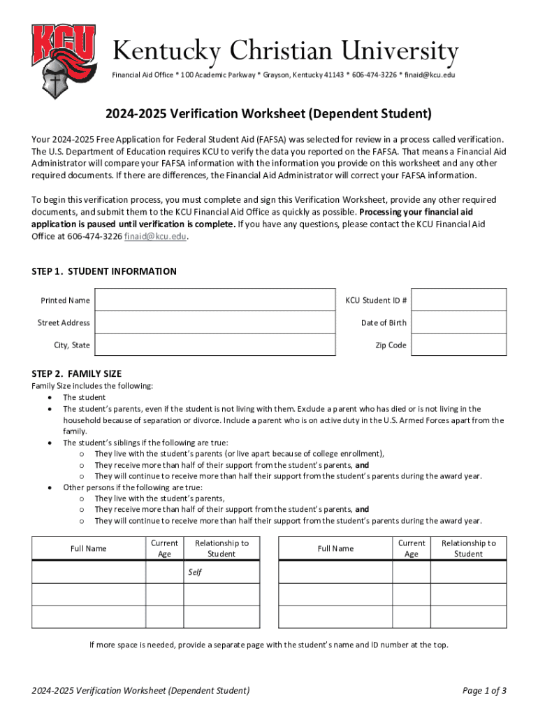 Kentucky Christian University Financial Aid Office * 100 Academic Parkway * Grayson, Kentucky 41143 × 6064743226 * finaid@kcu.edu20242025 Verification Worksheet (Dependent Student) Your 20242025