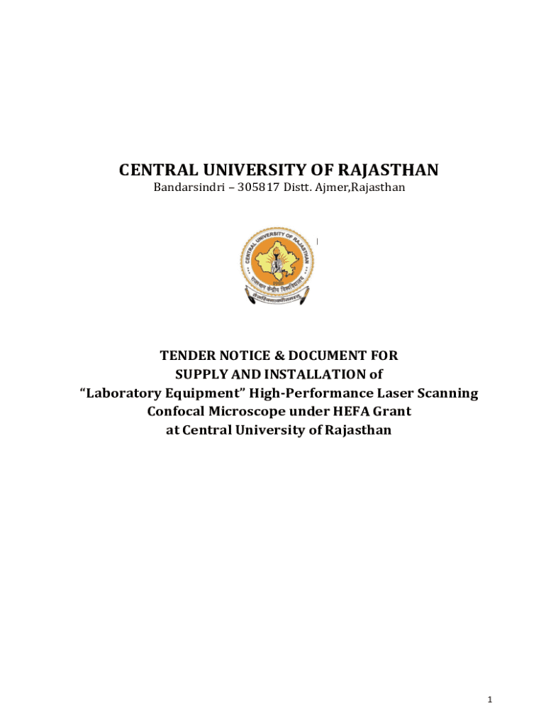 CENTRAL UNIVERSITY OF RAJASTHAN Bandarsindri 305817 Dist. Ajmer, RajasthanTENDER NOTICE & DOCUMENT FOR SUPPLY AND INSTALLATION of Laboratory Equipment HighPerformance Laser Scanning Confocal Microscope