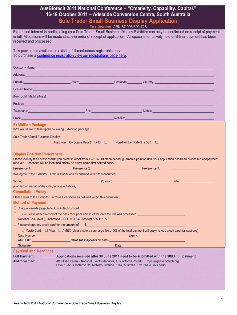 Get the free Sole Trader Small Business Display Application - AusBiotech - ausbiotech