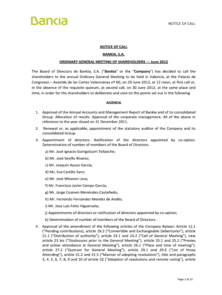 NOTICE OF CALLNOTICE OF CALL BAN KIA, S.A. ORDINARY GENERAL MEETING OF SHAREHOLDERS June 2012 The Board of Directors de Bankia, S.A. (Bank or the Company) has decided to call the shareholders to the