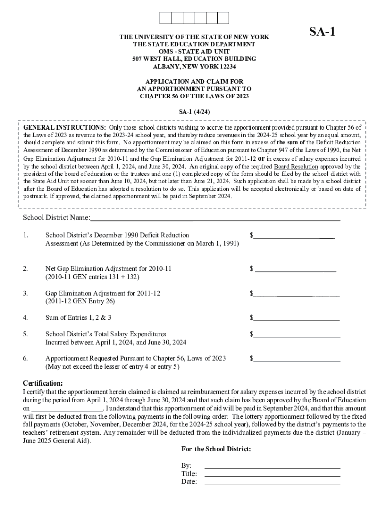 THE UNIVERSITY OF THE STATE OF NEW YORK THE STATE EDUCATION DEPARTMENT OMS STATE AID UNIT 507 WEST HALL, EDUCATION BUILDING ALBANY, NEW YORK 12234SA1APPLICATION AND CLAIM FOR AN APPORTIONMENT PURSUANT