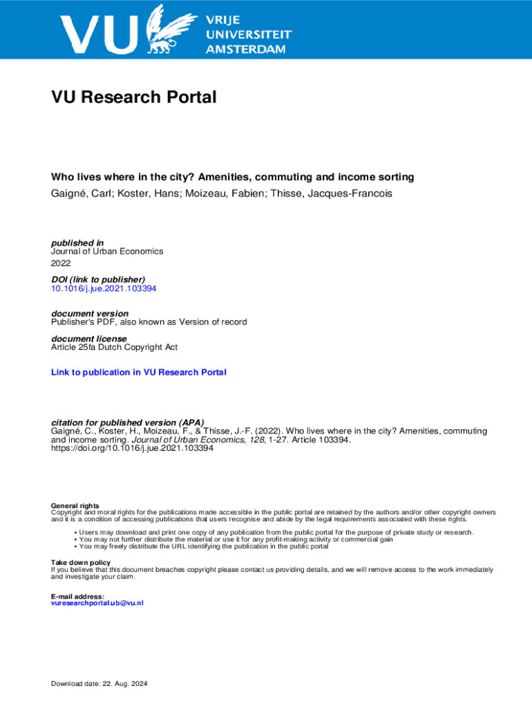VU Research Portal lives where in the city? Amenities, commuting and income sorting Gain, Carl; Foster, Hans; Fizeau, Fabien; This, JacquesFrancoispublished in Journal of Urban Economics 2022 DOI
