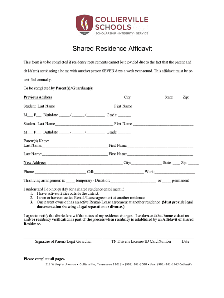 Shared Residence Affidavit This form is to be completed if residency requirements cannot be provided due to the fact that the parent and child(ren) are sharing a home with another person SEVEN days