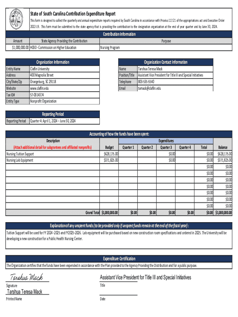 State of South Carolina Contribution Expenditure ReportThis form is designed to collect the quarterly and annual expenditure reports required by South Carolina in accordance with Proviso 117.21 of