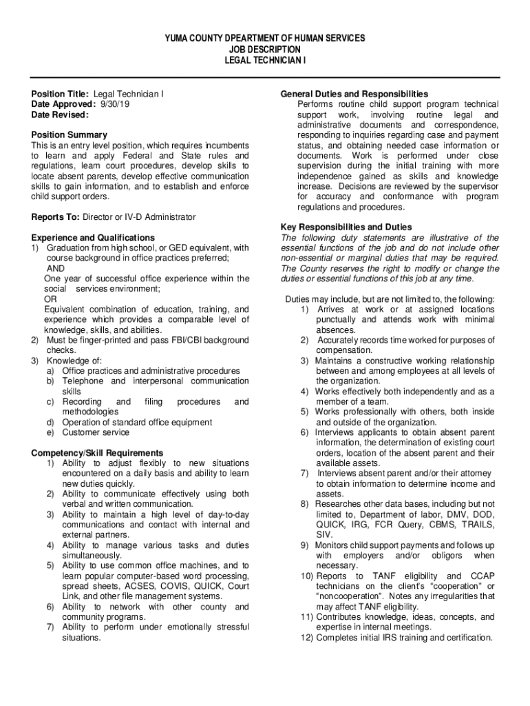 YUMA COUNTY DPEARTMENT OF HUMAN SERVICES JOB DESCRIPTION LEGAL TECHNICIAN IPosition Title: Legal Technician I Date Approved: 9/30/19 Date Revised: Position Summary This is an entry level position,