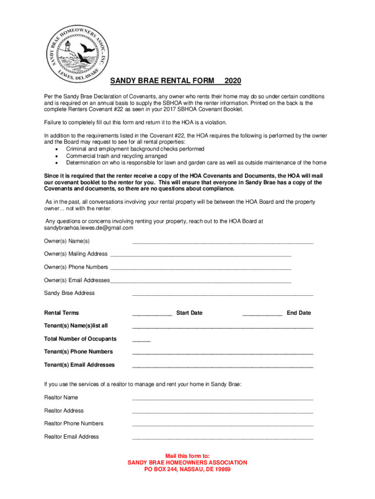 SANDY BRAE RENTAL FORM2020Per the Sandy Brae Declaration of Covenants, any owner who rents their home may do so under certain conditions and is required on an annual basis to supply the SBHOA with