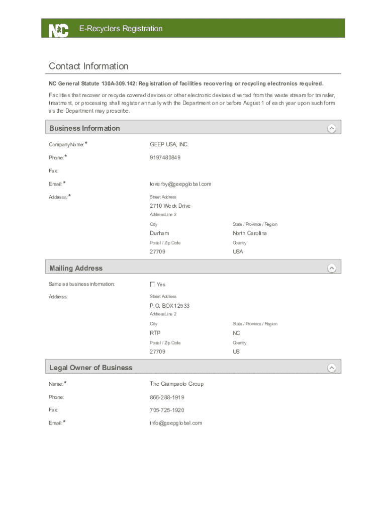 NC General Statute 130A309.142: Registration of facilities recovering or recycling electronics required.