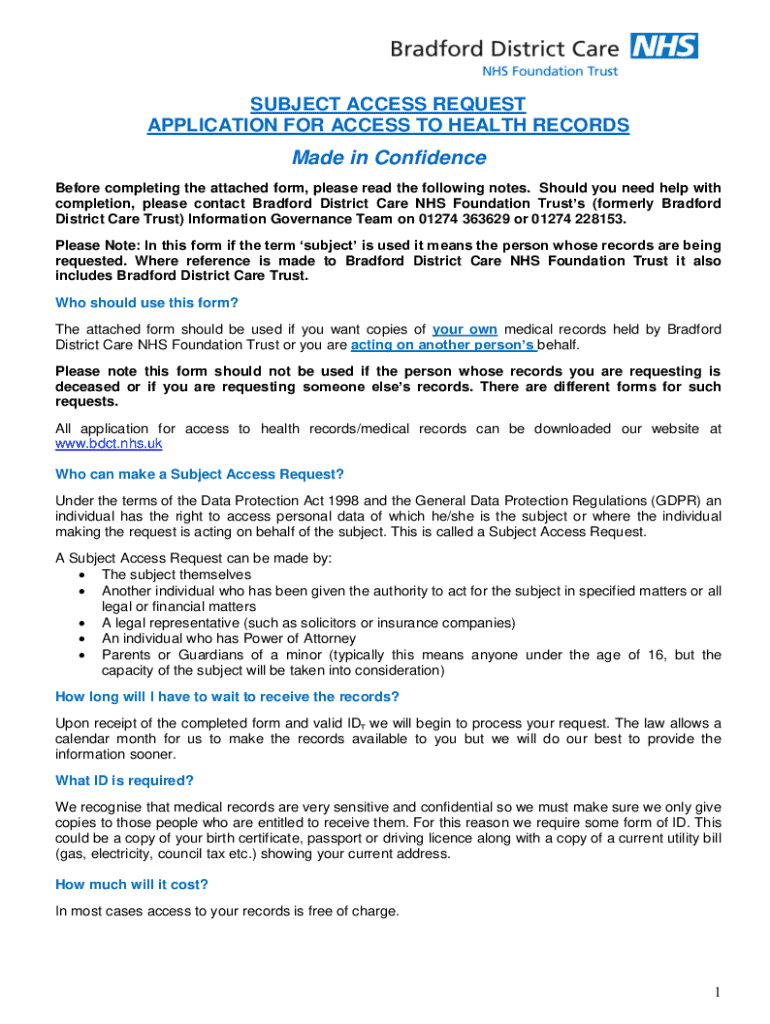 This documentation provides guidance on making a Subject Access Request for personal medical records at Bradford District Care NHS Foundation Trust.