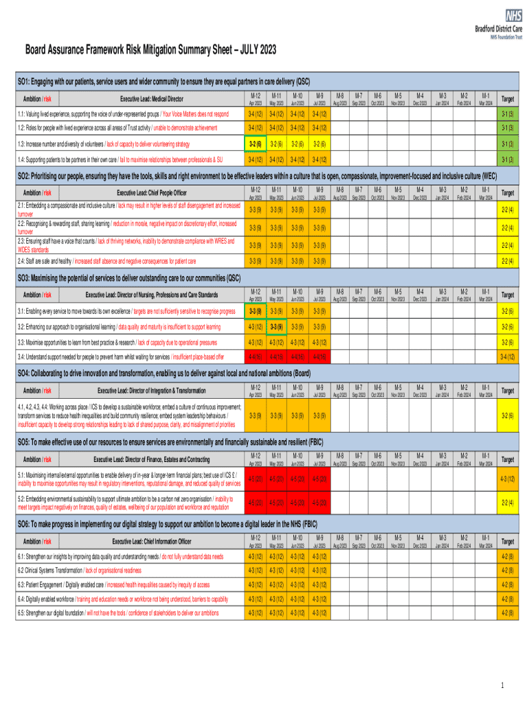 Board Assurance Framework Risk Mitigation Summary Sheet JULY 2023 SO1: Engaging with our patients, service users and wider community to ensure they are equal partners in care delivery (QSC) M12M11M10M9M8M7M6M5M4M3M2M1Apr