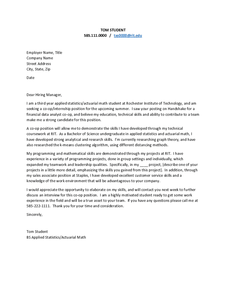 TOM STUDENT 585.111.0000 / txs0000@rit.eduEmployer Name, Title Company Name Street Address City, State, Zip DateDear Hiring Manager, I am a third year applied statistics/actuarial math student at