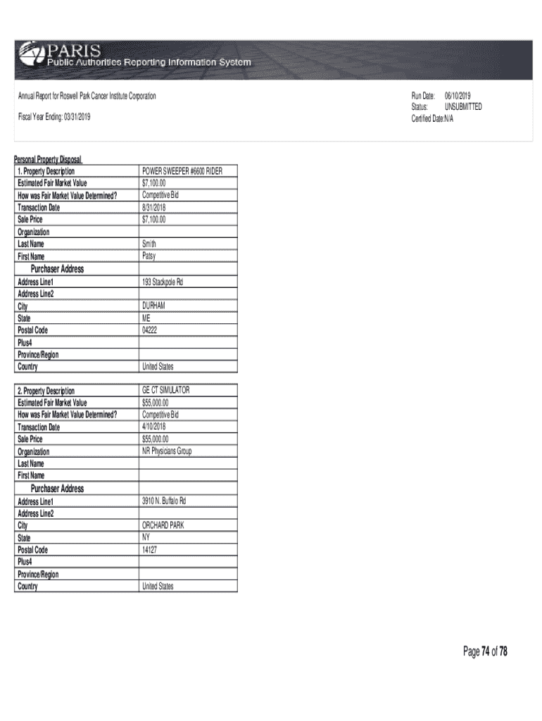 Annual Report for Roswell Park Cancer Institute Corporation Fiscal Year Ending: 03/31/2019Personal Property Disposal 1. Property Description Estimated Fair Market Value How was Fair Market Value Determined?