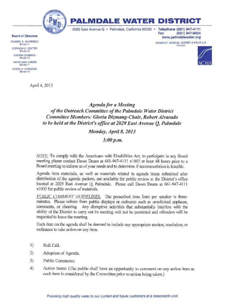 AGENDA ITEM NO. 4.6MEMORANDUM OF UNDERSTANDING BETWEEN The Antelope Valley Water Partners CaliforniaApril 2, 2013AVWPMOU20131Memorandum of Understanding regarding the Antelope Valley Water Partners