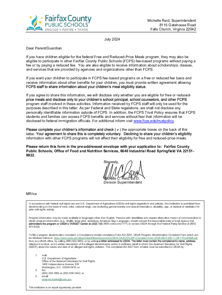 Michelle Reid, Superintendent 8115 Gatehouse Road Falls Church, Virginia 22042 July 2024 Dear Parent/Guardian: If you have children eligible for the federal Free and Reduced Price Meals program, they