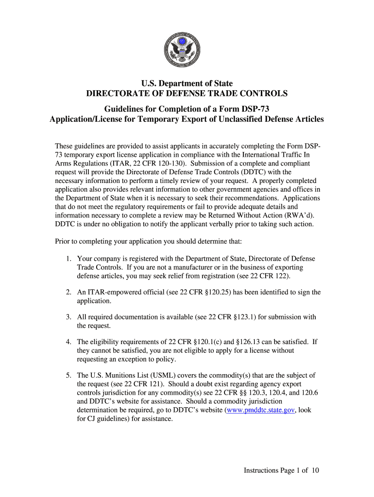 The dsp-73 is a form used by the U.S. Department of State for the temporary export or temporary import of classified defense articles and services.