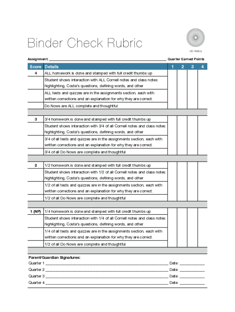 Binder Check Rubrics HIstoryAssignment: ___ Quarter Earned PointsScore Details 41234ALL homework is done and stamped with full credit thumbs up Student shows interaction with ALL Cornell notes and