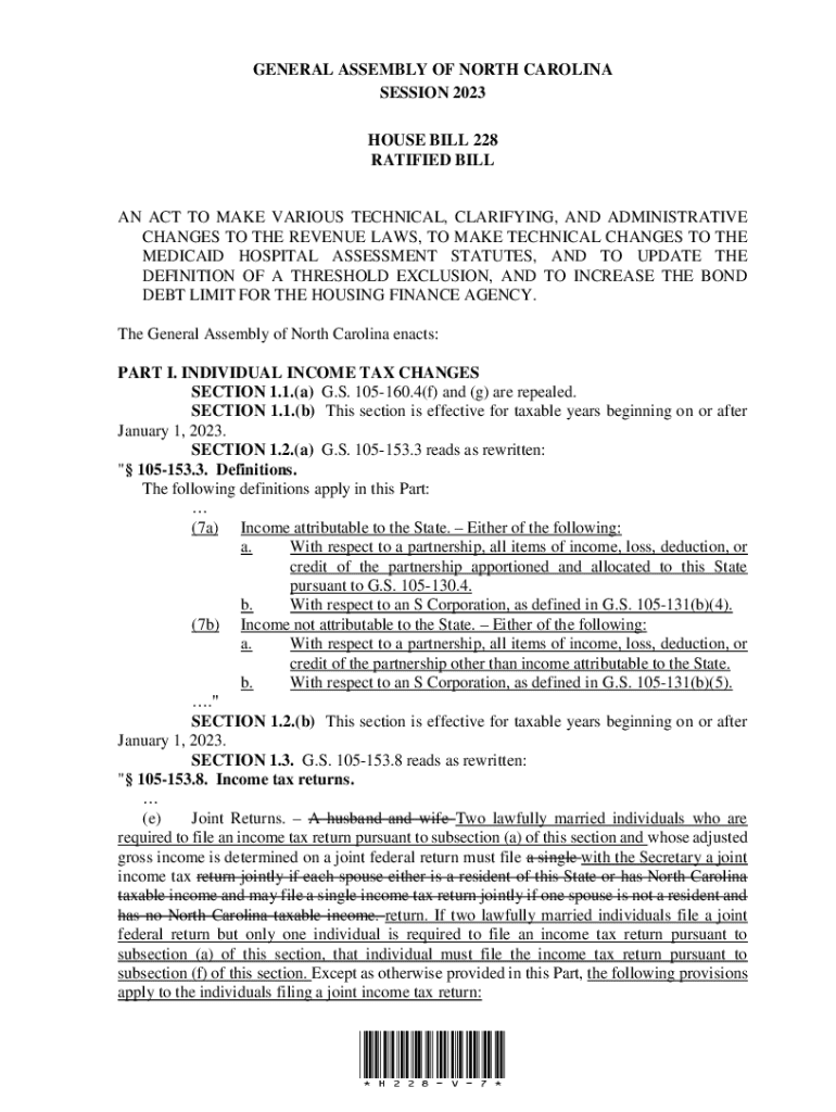 GENERAL ASSEMBLY OF NORTH CAROLINA SESSION 2023 HOUSE BILL 228 RATIFIED BILLAN ACT TO MAKE VARIOUS TECHNICAL, CLARIFYING, AND ADMINISTRATIVE CHANGES TO THE REVENUE LAWS, TO MAKE TECHNICAL CHANGES