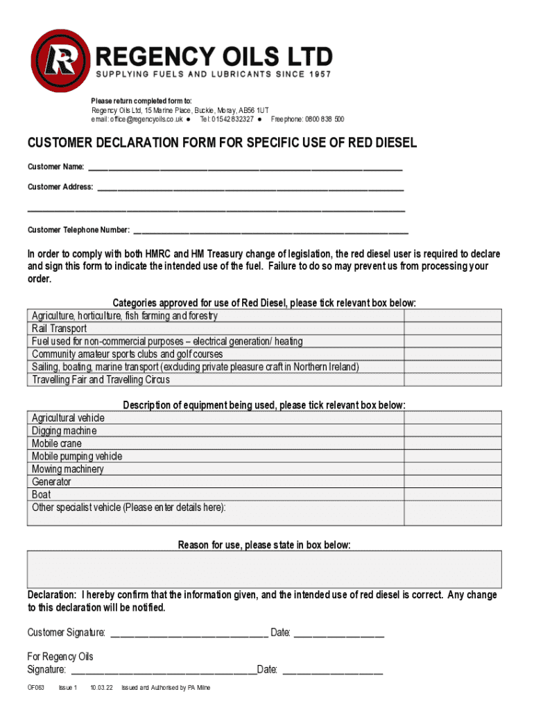Get the free OF063 - Customer Declation Form for Red Diesel .docx