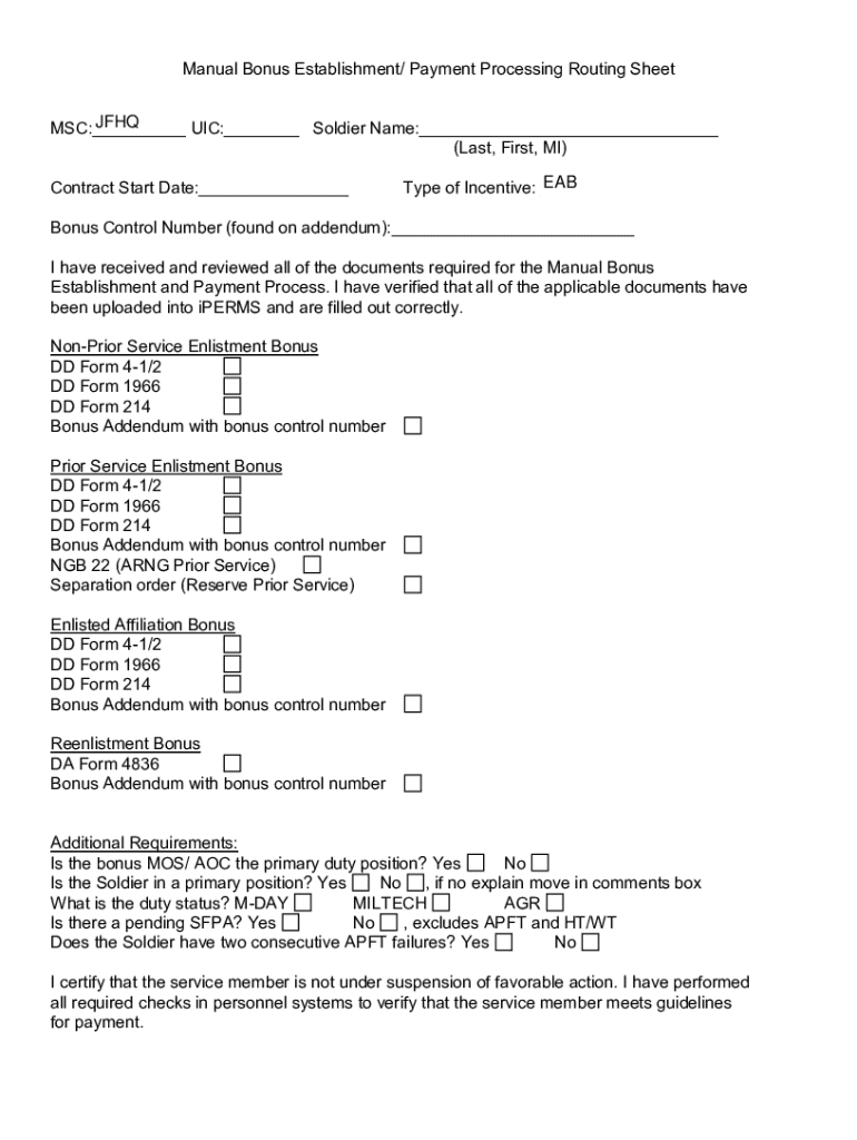 Manual Bonus Establishment/ Payment Processing Routing Sheet
