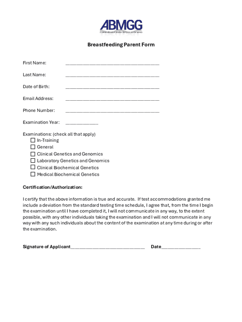 Breastfeeding Parent Formality and Procedure for Applicants Requesting Breastfeeding Test Accommodations Introduction The American Board of Medical Genetics and Genomics (AB MGG) will consider requests
