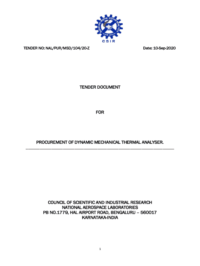 TENDER NO: NAL/PUR/MSD/104/20ZDate: 10Sep2020TENDER DOCUMENTFORPROCUREMENT OF DYNAMIC MECHANICAL THERMAL Analyzer.
