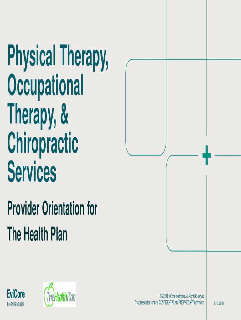 Physical Therapy, Occupational Therapy, & Chiropractic Services Provider Orientation for The Health Plan 2024 EviCore healthcare. All Rights Reserved. This presentation contains CONFIDENTIAL and PROPRIETARY