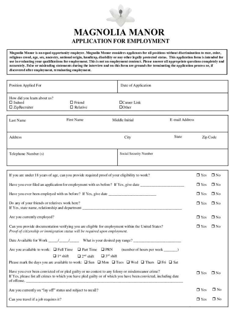 MAGNOLIA MANOR APPLICATION FOR EMPLOYMENT Magnolia Manor is an equal opportunity employer. Magnolia Manor considers applicants for all positions without discrimination to race, color, religious creed,