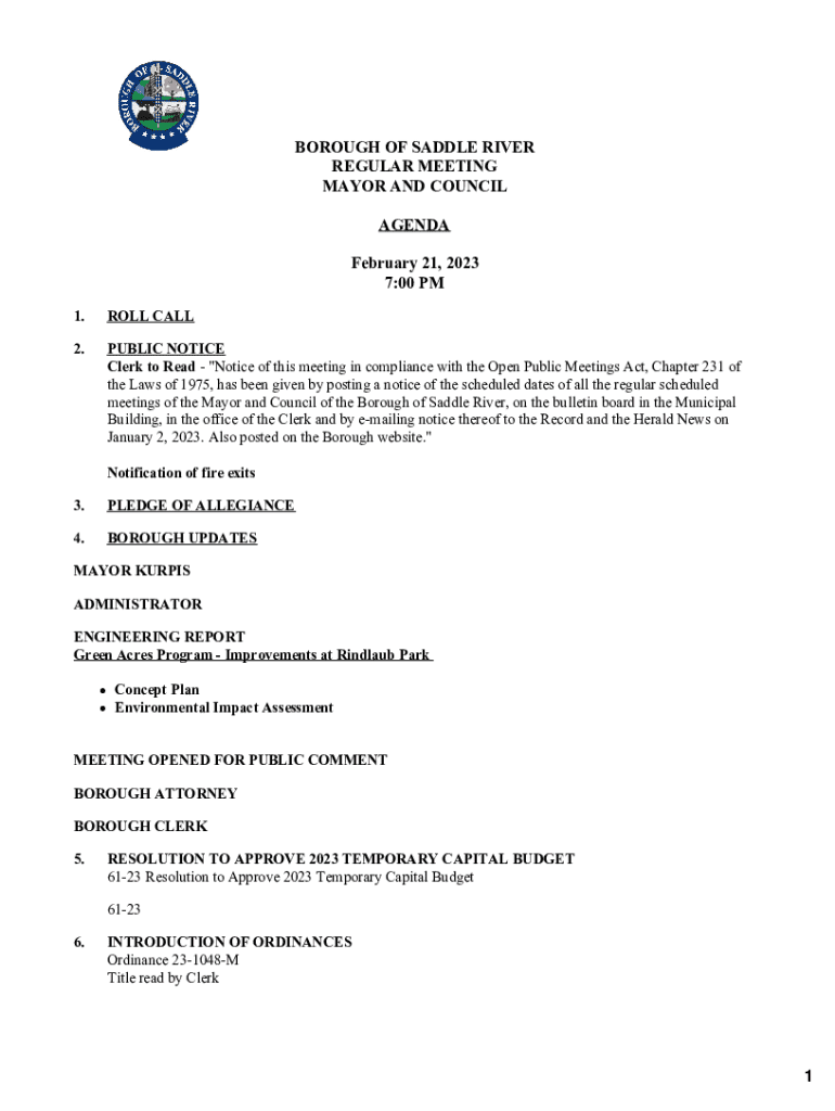 BOROUGH OF SADDLE RIVER REGULAR MEETING MAYOR AND COUNCIL AGENDA February 21, 2023 7:00 PM 1.ROLL CALL2.PUBLIC NOTICE Clerk to Read \”Notice of this meeting in compliance with the Open Public Meetings