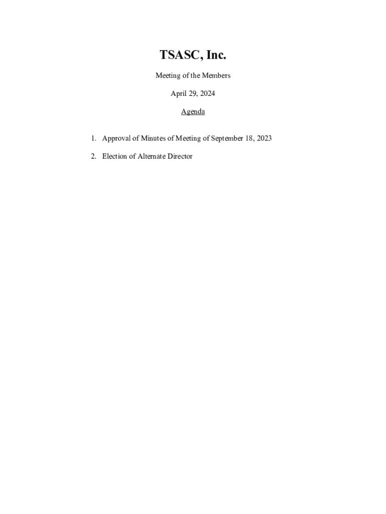 TSASC, Inc. Meeting of the Members April 29, 2024 Agenda 1. Approval of Minutes of Meeting of September 18, 2023 2. Election of Alternate DirectorTSASC, Inc. Meeting of the Members April 29, 2024