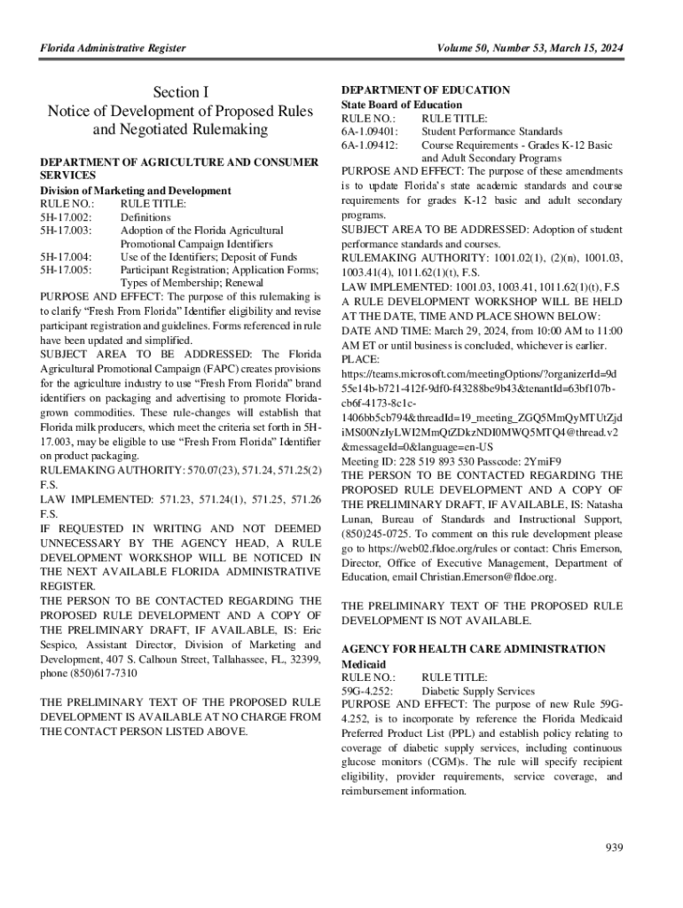 Florida Administrative RegisterSection I Notice of Development of Proposed Rules and Negotiated Rulemaking DEPARTMENT OF AGRICULTURE AND CONSUMER SERVICES Division of Marketing and Development RULE