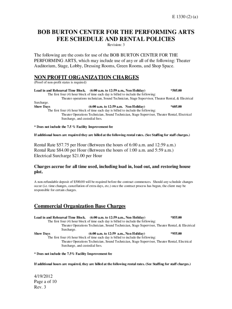 E 1330 (2) (a)BOB BURTON CENTER FOR THE PERFORMING ARTS FEE SCHEDULE AND RENTAL POLICIES Revision: 3The following are the costs for use of the BOB BURTON CENTER FOR THE PERFORMING ARTS, which may