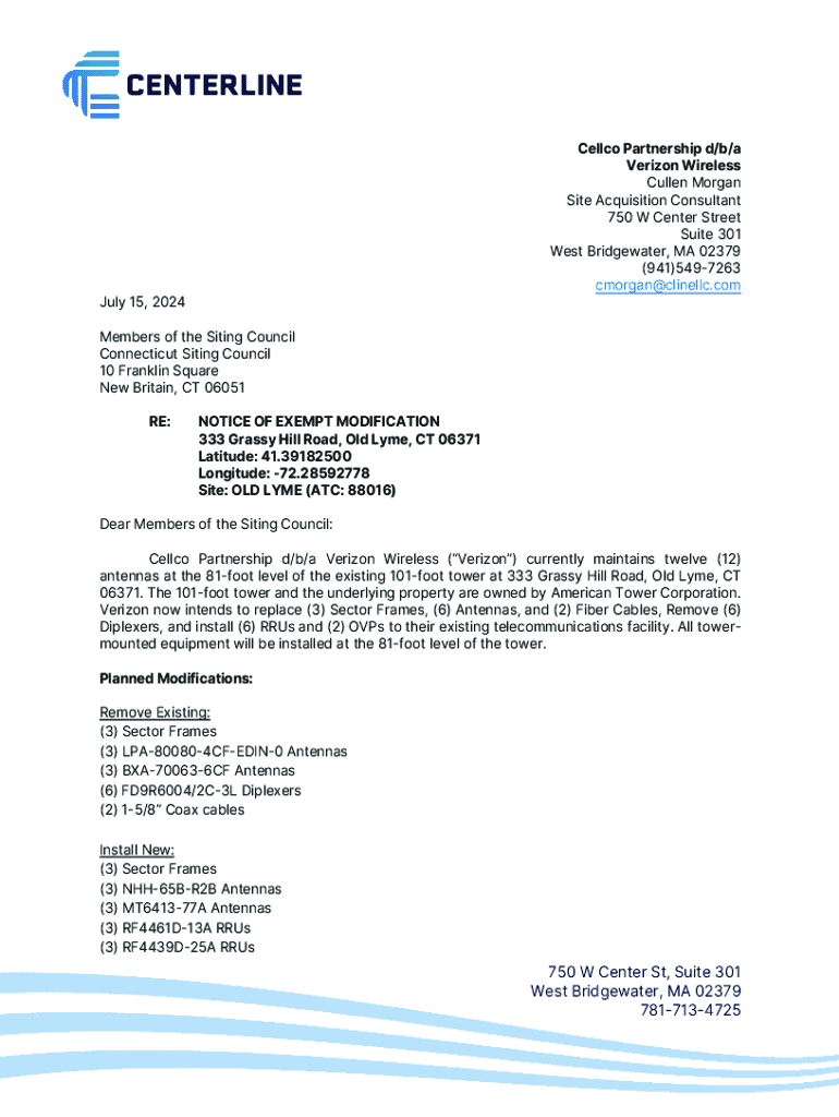 Cellco Partnership d/b/a Verizon Wireless Cullen Morgan Site Acquisition Consultant 750 W Center Street Suite 301 West Bridgewater, MA 02379 (941)5497263 cmorgan@clinellc.comJuly 15, 2024 Members
