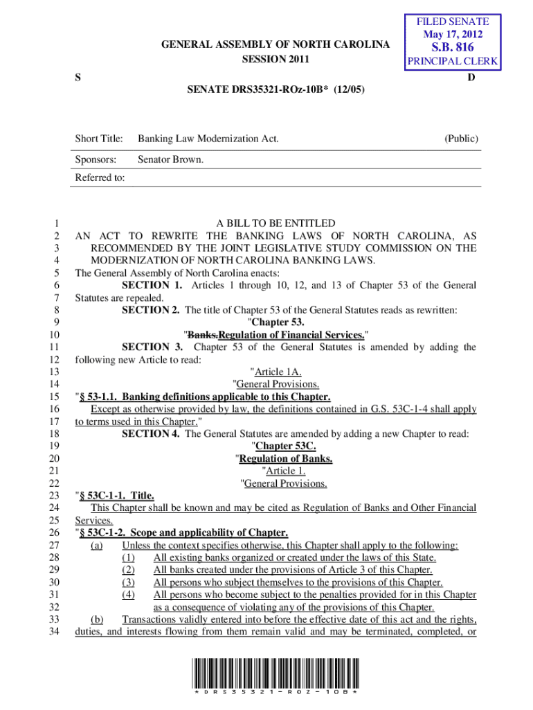 FILED SENATE May 17, 2012, GENERAL ASSEMBLY OF NORTH CAROLINA SESSION 2011 SS. B. 816 PRINCIPAL CLERK SENATE DRS35321ROz10B* (12/05)Short Title:Banking Law Modernization Act. Sponsors:Senator Brown.(Public)Referred