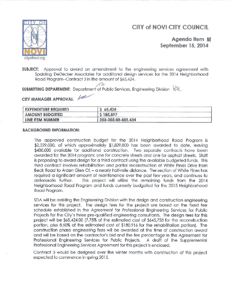 CITY of NOVI CITY COUNCIL Agenda Item M September 15, 2014SUBJECT: Approval to award an amendment to the engineering services agreement with Spalding DeDecker Associates for additional design services