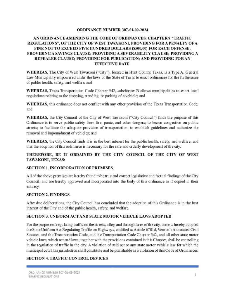 ORDINANCE NUMBER 30701092024 AN ORDINANCE AMENDING THE CODE OF ORDINANCES, CHAPTER 9 TRAFFIC REGULATIONS, OF THE CITY OF WEST AWAKEN, PROVIDING FOR A PENALTY OF A FINE NOT TO EXCEED FIVE HUNDRED DOLLARS