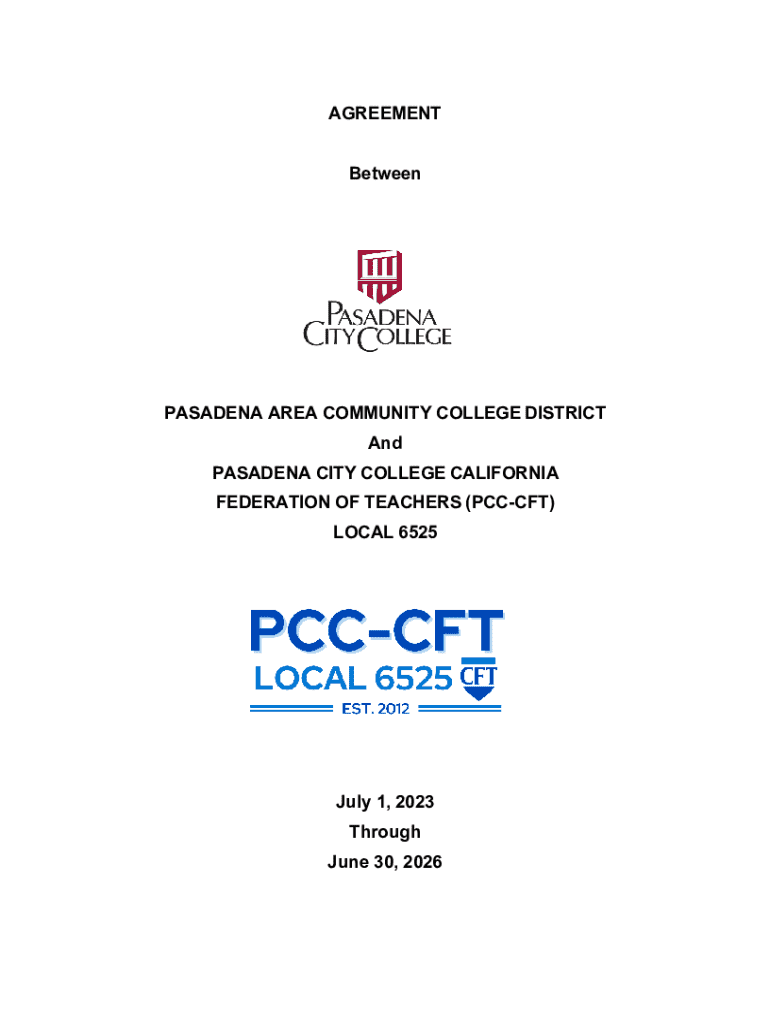 AGREEMENT BetweenPASADENA AREA COMMUNITY COLLEGE DISTRICT And PASADENA CITY COLLEGE CALIFORNIA FEDERATION OF TEACHERS (PCCCFT) LOCAL 6525July 1, 2023 Through June 30, 2026TABLE OF CONTENTS Article