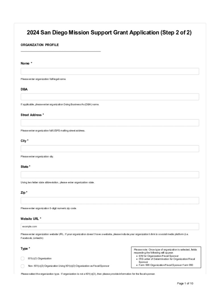 2024 San Diego Mission Support Grant Application (Step 2 of 2) ORGANIZATION Filename *Please enter organization full legal name.Drain applicable, please enter organization Doing Business As (DBA)