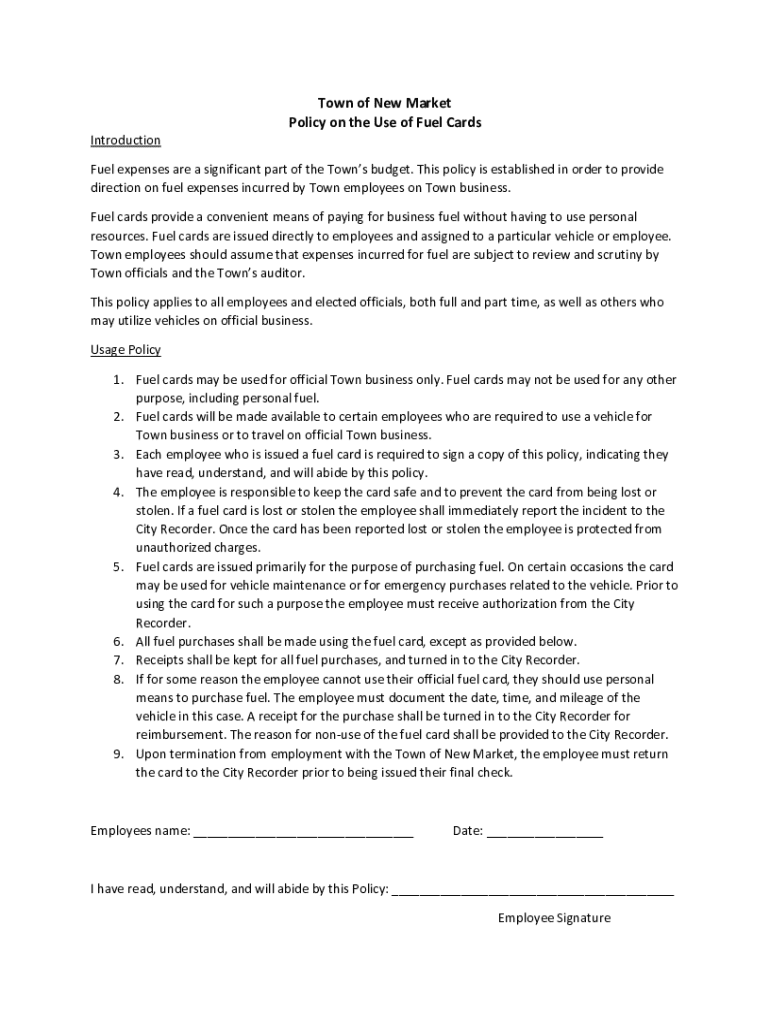 Get the free Town of New Market policy on the use of fuel cards. Purchasing--Policies and Procedures